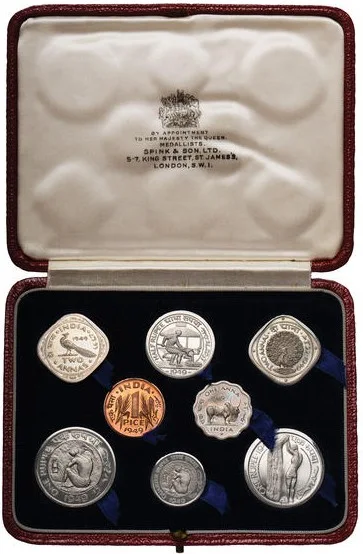 A highly important and exceedingly rare complete set of eight patterns. Only four sets are recorded as having been struck. All with matching proof-like surfaces, a few faint hairlines, but all brilliant mint state, in red leather Spink presentation case. Another set of these patterns was sold at Baldwin's Auction 71 in September 2011, lot 1609. This set however varies from the Baldwin's set as it contains two different examples of the rupee coin and one ½ rupee, while the Baldwin's set contained only one 1 rupee but two ½ rupees. No coins were struck for circulation dated 1948 or 1949. However, due to Partition and Independence, a distinct new series of designs were required. After Partition in July 1947 and the achievement of Independence by both India as well as the newly-created Pakistan, both countries thought to create new and distinctive coinages. During 1946 rupee coinage in nickel had been introduced in India, comprising the ½- and ¼ rupee struck in that year, followed in 1947 by a 1-rupee issue, with additional ½- and ¼ rupees of a similar design. The initial coinage of approximately 460 million pieces apparently sufficed until 1950 when new designs were introduced. However, in 1949 a fine pattern coinage was prepared by artist/engraver Patrick Brindley. It is not known whether final dies were actually prepared for these patterns, or whether the master matrices were used to strike the coins. For various reasons each of the 1949 patterns was rejected, leading to other designs introduced in the following year. The Spink Numismatic Circular of 1954 reports that only four sets of these patterns were struck. This set, housed in a Spink presentation case, was acquired from Spink at a later date - apparently the original price in 1954 was £100. It should be noted that it is uncertain whether the 'patterns' listed in Krause Mishler of ¼-, ½- and 1 rupee for 1947 are actually patterns, or whether at a later date the new Ashoka obverse proposed for the 1949 patterns was mated or perhaps muled with the currency 1947 reverse dies (60000-80000 GBP).